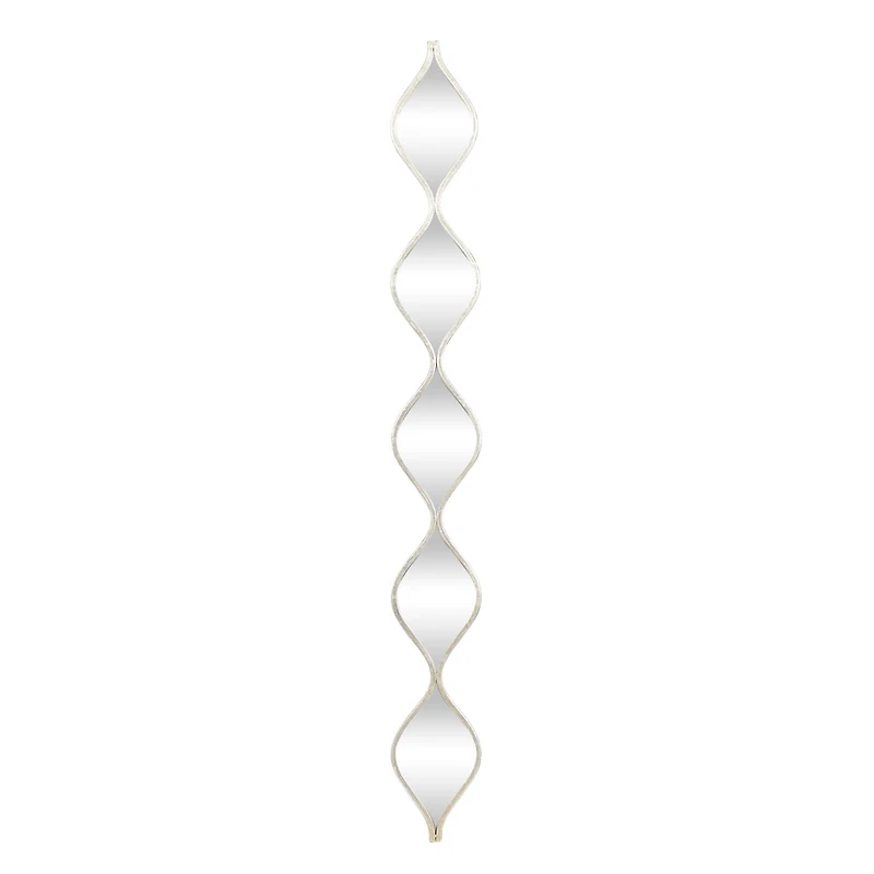 If you can't put your finger on what's missing for a small vintage themed wall that needs a little something, this versatile yet uniquely stylish silver mirror is what you've been looking for. Teardrop-like metal silhouettes finished in distressed metallic silver create a long, ornamental frame housing reflective mirrors.Details:Silver6.63" x 1" x 58.44" (full dimensions)Wood and glassKeyhole on back for easy hangingFor indoor use