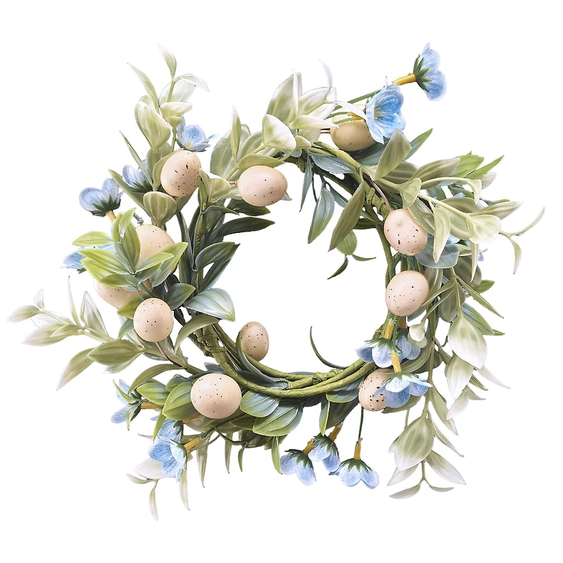 Spruce up your space for Easter with this coiled blossom and egg garland from Ashland. The mix of blue blossoms and spotted eggs will look lovely draped along a shelf or ledge or as a part of a centerpiece on your dining room table.Details:Blue, green, and cream5 ft. (1.5 m)Polyethylene, polyethylene foam, polyester, and iron wireFor indoor use