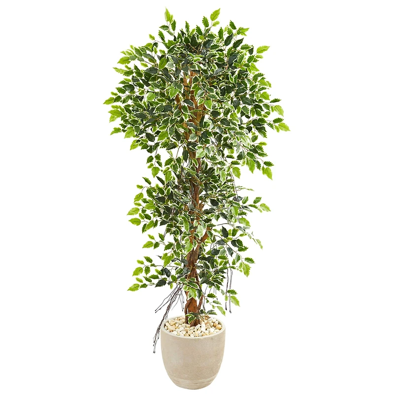 The artificial elegant ficus tree stands at 63" tall. Its multiple delicate green leaves sprout out from brown stems, all contained within a sandstone planter. With its natural, tranquil appearance, it’s a good décor piece to be settled into a quiet, secluded space, like a study room or reading nook. You can place it behind your chair, couch, or beside a low bookshelf filled with your favorite classics for a lovely finish.Details:Green plant in sandstone planter25" x 27" x 63"From synthetic materialsFor indoor or covered outdoor use