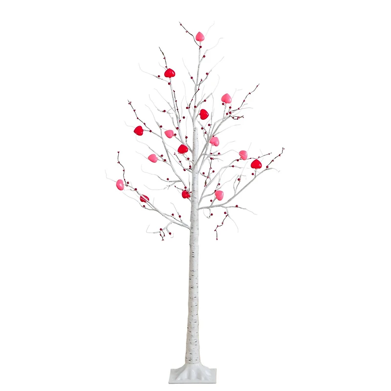 Berry in love and bring a little woodland romance home with this 5-ft pre-lit Valentine's Day artificial twig tree with berries and heart-shaped LED lights. Designed with glowing red and pink heart-shaped LED lights and clusters of vibrant red berries, this piece adds a mix of both cozy and charming. Inspired by white birch-style branches for a soft, natural look, it brightens any space. DIY and style it in your entryway to your living room or even the office. Just plug it in and let it shine! The glow makes every day feel a little more special. Because love should never be seasonal.Details: Feel berry in love with this Valentine's Day inspired 5-ft pre-lit artificial twig tree with and heart-shaped LED lightsPre-lit with 72 heart shaped warm white energy-efficient LED lightsCrafted from premium materials, the heart-shaped LED lights and berries add a fun touch that'll liven wherever displayed. From mantels, offices, desktops and moreBend and shape the branches for a custom look, stands in a sturdy white baseRecommended for decorative indoor use Product Dimensions: 5ft. H x 30in. W x 30in. D