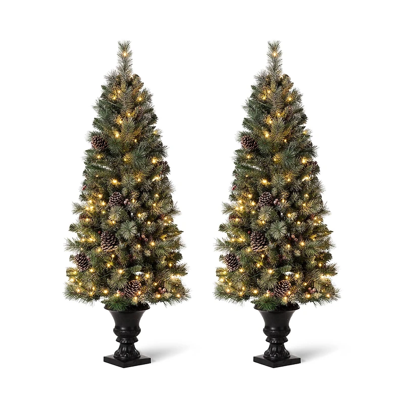 This tree set with decorative urn base is a welcoming addition to doorway, deck, porch or patio. It features snow sprinkled branches and is trimmed with red berries and pine cones. This tree set is pre-lit with 130 warm white lights that remain lit even if a bulb burns out. Display this attractive greenery in any indoor or covered outdoor location.Tree Style:Pine2 treesFlocked finishFull372 tipsFrom synthetic materialsDimensions:5 ft. height25.98" diameterLighting Information:Warm White130 incandescent bulbsFeatures:Housed in black urnDecorated with red berries and pine conesFor indoor or outdoor use