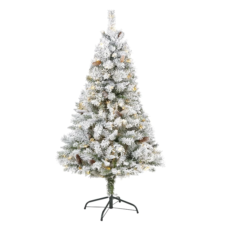 Create a picturesque Christmas this holiday season with the help of this Flocked White River Mountain Pine Artificial Christmas Tree. Easy to set-up and entirely maintenance-free, this winter-inspired Christmas tree boasts a robust collection of realistic looking foliage consisting of easy-to-bend branches. Arriving pre-strung with clear LED lights for stress-free decorating, this versatile 5ft. tall frosted artificial Christmas tree will undoubtedly transform any home or office into a joyous holiday setting for years to come.Tree Style:FullFlockedFaux pinecone accents360 branch tipsDimensions:5 ft. (1.52 m) height32" (81.28 cm) diameterLighting Information:Clear150 LEDFeatures:Easy to bend branch tipsRecommended for indoor use onlyIncludes metal tree stand