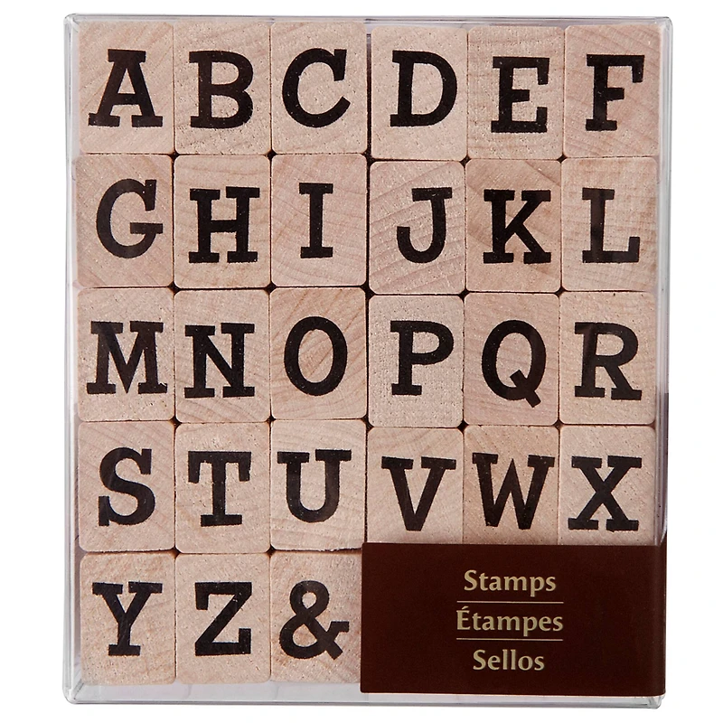 This wood-mounted stamp set is a great addition to any paper crafter or scrapbooker's collection. This useful set lets you customize your own messages in fun capital letters with serifs, perfect for creating your own one-of-a-kind scrapbooks, cards, announcements and other projects. Just reach for some quality cardstock and an ink pad, embossing materials or your favorite glitter to use with this stamp set. Details:Each stamp measures 0.875" x 0.625" x 1"6 sets (30 stamps per set, 180 total stamps)26 letters and 4 symbolsRubber mounted on maple wood blocks