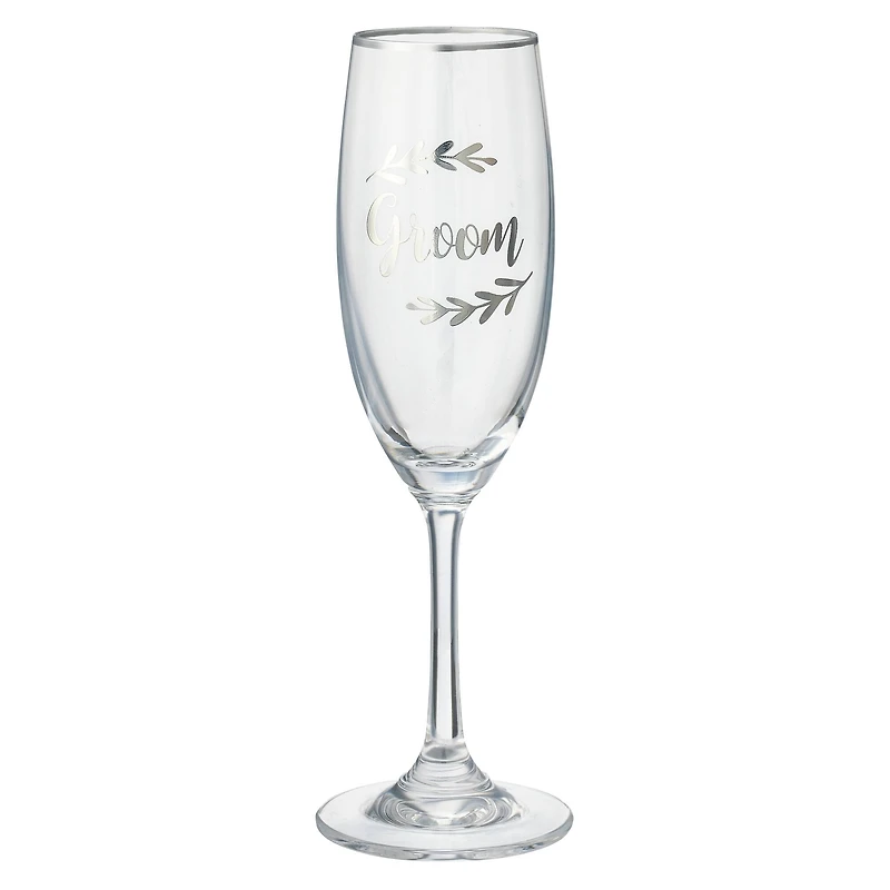 Celebrate your special day with this "Groom" toasting flute by Celebrate It. Use it during your reception or bachelor party to toast with, then have for a keepsake for years to come.Details:Clear and silver colored2.5" x 2.5" x 8.5" (6.35cm x 6.35cm x 21.59cm) flute size6 flutesGlass