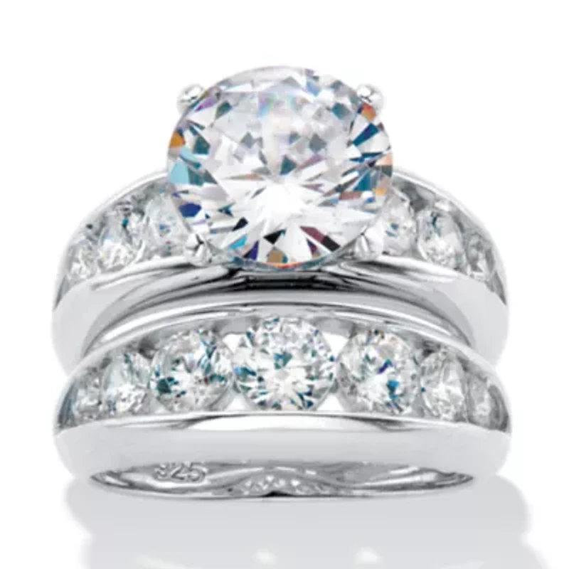 Possessing 6.09 carats T.W. of mega-watt sparkle, this round cubic zirconia wedding set is a high fashion knockout with its round channel-set cubic zirconia stones in graduated sizes. Silvertone. Sizes 6-10. Main Stone: 1 Round Faceted Cut Cubic Zirconia, 4.00 carats, 10 mm x 10 mmAccent Stone: 13 Cubic Zirconias 2.09 cttwSilvertone; Contains 10.60 grams of BrassMeasures: 20 mm wide x 30 mm long x 9 mm high; Shank Width: 5.0 mm wideIncludes gift box and drawstring pouchSilvertoneContains 10.60 grams of BrassShank Width: 5.0 mm wideDimensions: 20 mm wide x 30 mm long x 9 mm highIncludes gift box and drawstring pouch 2 14 Polished finish Warranty available China Imported Product Specifications 1.14 in x 1.18 in x 0.79 in 6.09 Material & Care Metal, Silver-tone metal Clean with a soft cloth.