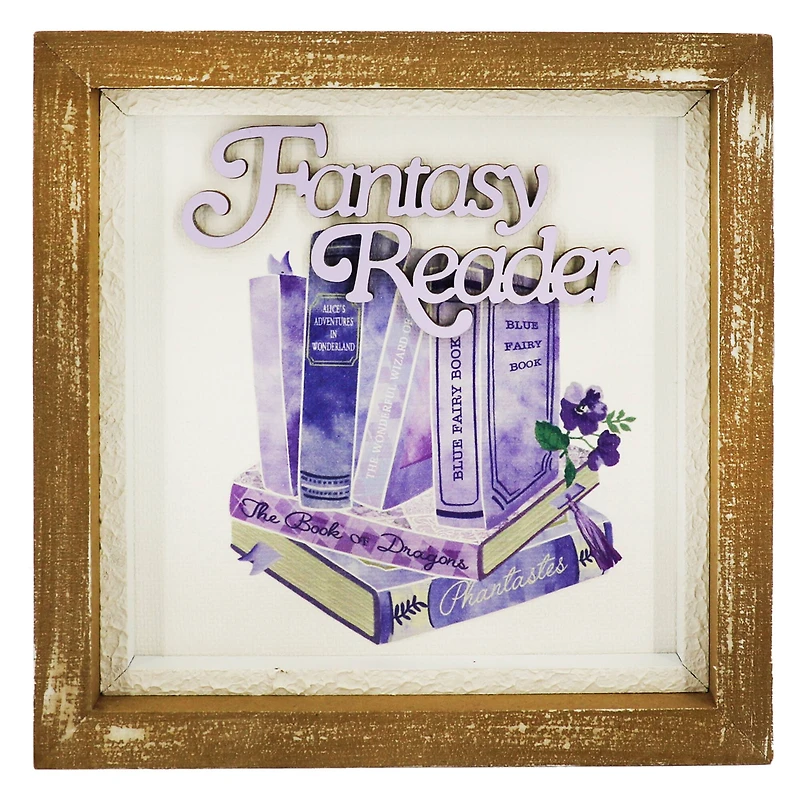 This "Fantasy Reader" tabletop décor features real fantasy titles in the feminine and fun design of stacked books. Because of the block shape, you can easily decorate your shelf, mantel or dress with this standalone piece.Details:Purple, white and brown16.38" x 1.5" x 16.38" (41.5cm x 3.8cm x 41.5cm)MDF, copper-coated paper and plywoodComplies to TSCA Title VIFor indoor décor use only