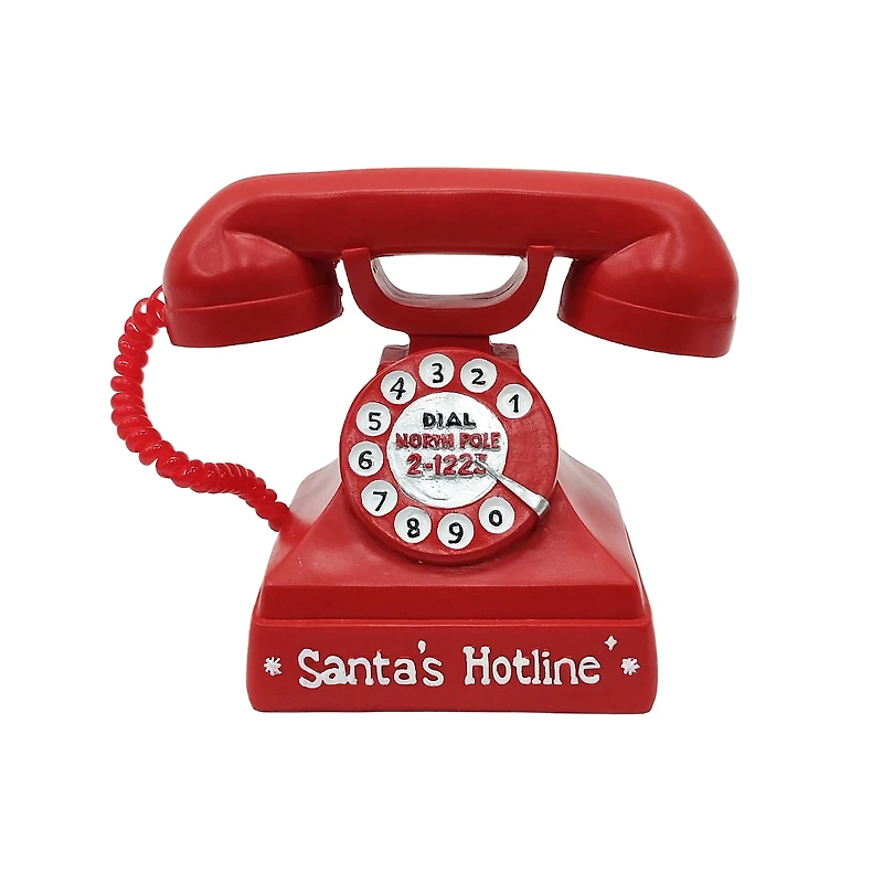 Bring festive charm to your home for the holidays with this old school phone tabletop accent from Ashland. Featuring a red hue and the words "Santa's Hotline," this piece will be right at home nestled in faux snow alongside evergreens and woodland critter figurines on your mantel for a fun display this Christmas season.Details:Red6.38" x 3.54" x 5.12" (16.2cm x 9cm x 13cm)Peppermint Lane collectionResin, stone powder and plasticFor indoor decorative use