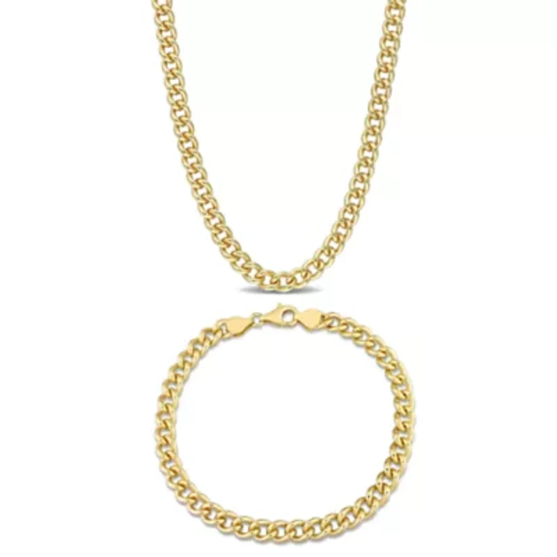 Elevate your everyday style with this versatile necklace and anklet set, featuring 6.5mm curb link chains crafted in yellow-plated sterling silver. Both pieces catch the light beautifully, creating a subtle shimmer that enhances any outfit. Perfect for layering together or wearing separately, this set combines modern edge with timeless sophistication, making it an essential addition to any jewelry collection. 2 Lobster closure Polished finish Warranty available, 60 days Italy Imported Product Specifications 20", 9" Material & Care Yellow Plated Sterling Silver Metal, Sterling silver Clean with a soft cloth.