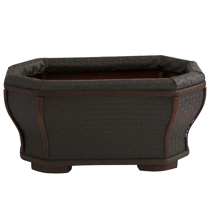 The classic look of wood and leather come alive in this stately planter. With the bold, darks of wood and leather, this handsome planter also features delicate curves and sturdy feet that give it an interesting appeal just perfect for some bright flowers or similar. Or use it to store magazines or similar - the possibilities are endless. Makes a thoughtful gift as well.
