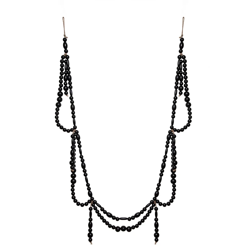 Fill your home with Christmas joy using this traditional beaded garland. This decorative garland has layers of black wood beads strung on a jute cord, perfect to string along bannisters, counter edges, entryways and even your Christmas tree.Details:Black bead design6 ft. (1.8 m) lengthWood and juteFor indoor use