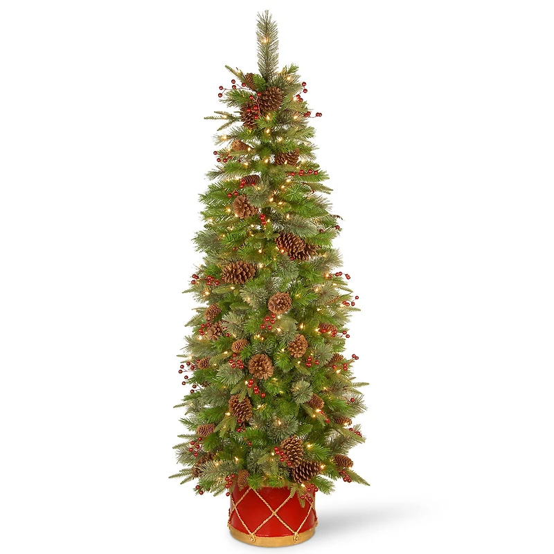 This Colonial Slim Half Tree features a flat backside designed for display against a wall or where floor space is limited. It also features Feel Real® branch tip technology, creating a tree with remarkable realism. It is pre-strung with 200 clear lights and trimmed with red berries and pinecones. A bright red and gold simulated drum base adds the finishing touch to this attractive holiday decoration.Details:Green6 ft. (1.829 m) tall, 28" (71.12 cm) diameter312 easy-to-shape branch tips200 clear incandescent lightsSlim profilePE and PVCDecorative drum baseRed berries and pineconesRecommended for indoor use only