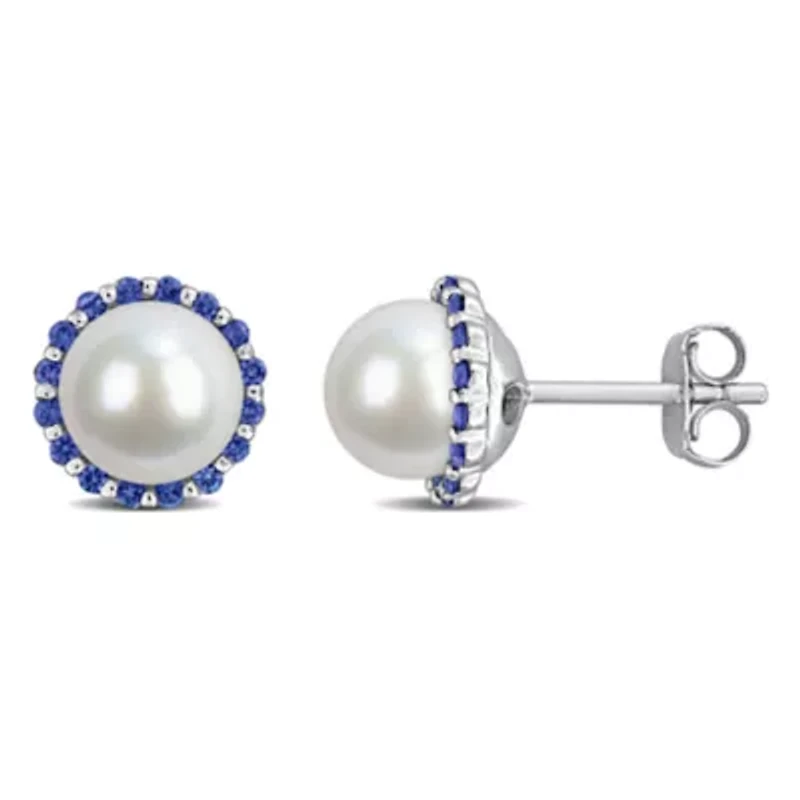 These stud earrings are crafted in polished sterling silver and designed to highlight the natural beauty of freshwater cultured pearls framed by a luminous gemstone halo. Each pearl displays a soft radiant glow while the surrounding sapphire emerald or ruby accents add depth color and refined contrast. The halo design enhances the brilliance of the centerpiece while creating a balanced and elegant silhouette on the ear. Comfortable and timeless these earrings transition effortlessly from everyday wear to special occasions. A graceful combination of classic pearls and vibrant gemstones that brings enduring elegance to any jewelry collection. Post back, Butterfly clasp Polished finish Prong setting Warranty available, 60 days Thailand Imported Belk Exclusive Material & Care Sterling Silver Metal, Sterling silver Clean with a soft cloth.