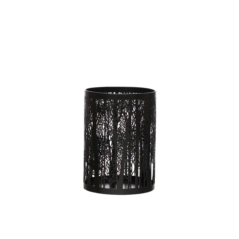 Bring the calming silence and dark romance of winter nights to your holiday decorating with this black pillar candle holder from Ashland. Featuring cut outs the create a forest scene for the light to shine through, this eye-catching piece will look right at home among silver and midnight hues and an arrangement of snowy white blooms in your entry way for the Christmas season.Details:Black5" x 5" x 7" (12.7cm x 12.7cm x 17.8cm)IronHolds 1 pillar candle up to 3" x 4" (7.6cm x 10.1cm)Recommended for indoor use onlyWARNING: Burn within sight. Keep away from things that catch fire. Keep away from children and pets.