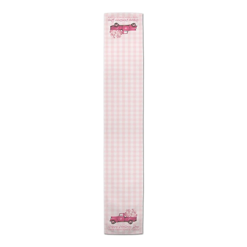 This table runner will add a cute seasonal touch to your home and table this season. Designed and printed in the United States to display vibrant colors, this is a design you're sure to love.Details:Farm fresh hugs & kisses (pink and white) pattern72" x 16"Poly twill fabricSingle-sided printFinished hemmed edging