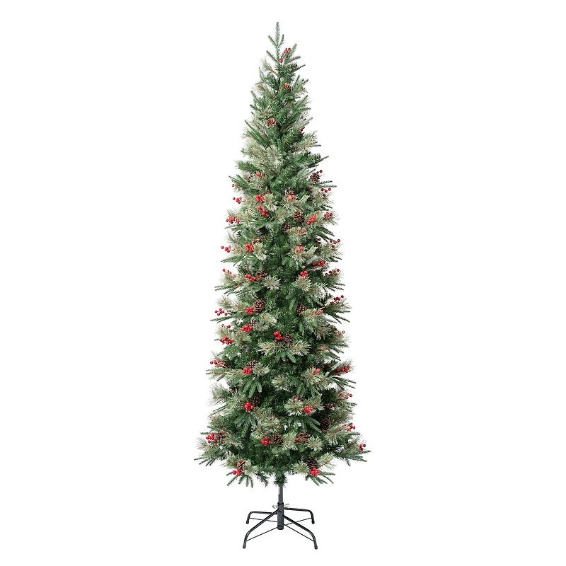 Create new Christmas memories with the Feel Real® Virginia Pine Slim Mixed Hinged Tree. This tree features Feel Real® branch tip technology, offering remarkable realism with crush-resistant tips molded from real branches. Its slim silhouette is ideal for rooms with limited space and is trimmed with 72 red berries and 72 pinecones for festive charm. Hinged branches allow for easy setup and storage.Tree Style:Slim Virginia PineGreen with soft cashmere tips801 tipsSingle treeUnlitPVCDimensions:7.5 ft. heightFeatures:Fire retardantEasy to shape branchesReal touch FeelHinged construction for quick setupIndoor use onlyIncludes sturdy folding metal stand