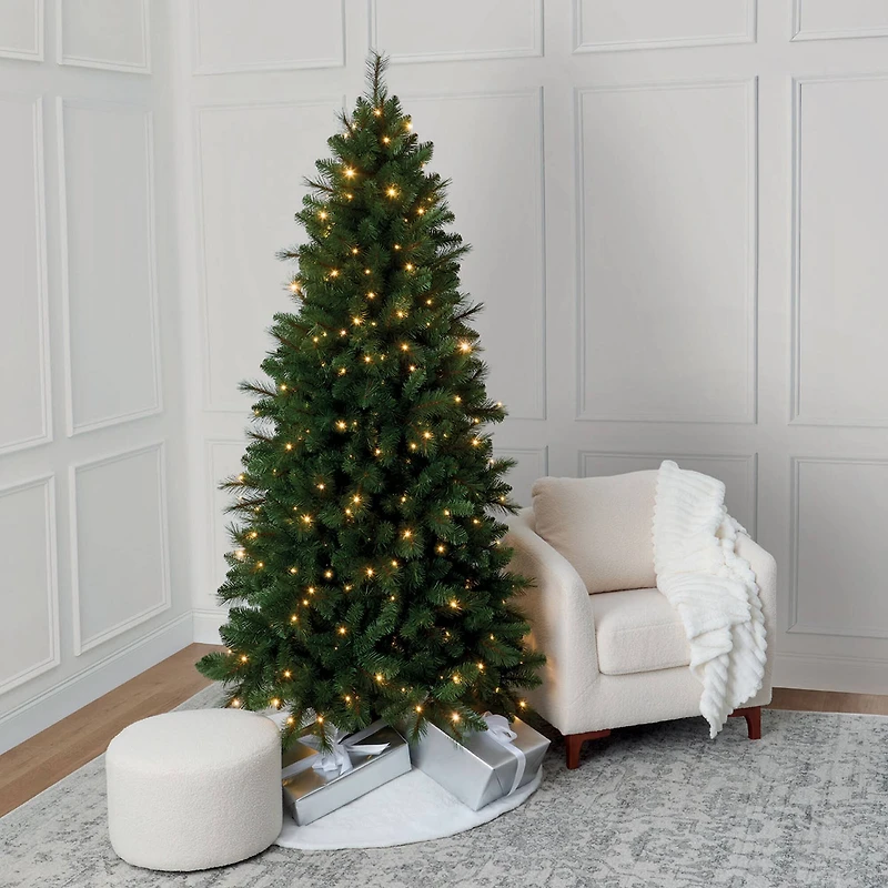 Introducing the magnificent Ashland 7ft Pre-lit Hudson Pine artificial Christmas tree that will bring joy to any occasion. Thanks to the 250 LumaDazzle 11-function color-changing LED lights with twinkling effects, it creates an inviting ambiance. With its 828 branch tips made of a hard needle mix, this artificial pine tree will captivate your holiday guests. The tree's 42-inch diameter (106cm) base provides stability, while the folding metal tree stand ensures easy setup and storage. A foot pedal is included to switch the lights on and off. Whether placed in your living room or office space, the Ashland 7ft Hudson Pine artificial Christmas tree is the perfect option for spreading holiday cheer.Assembly InstructionsTree Style:Carton #278Full Hudson Pine828 classic branch tipsPVC and hard needle constructionDimensions:7 ft. (2.1 m) height42" (106 cm) diameter42"L x 11"W x 14"H (106cm L x 27.9cm W x 35.6cm H) storage sizeLighting Information:Color Changing250 LumaDazzle twinkle LED lights11 twinkling light effects: Combination, Clear Steady, Color Steady, Clear Twinkling, Color Twinkling, Clear Fading, Color Fading, Clear & Color Alternating, Clear & Color Fast Blinking, Clear & Color Slow Blinking, Clear & Color FadingFoot pedal includedFeatures:Flame RetardantPre-attached hinged branchesPremium metal stand includedFor indoor use only3 Year Tree & Light WarrantyFAQIs This Christmas Tree Easy to Set Up?Yes, it can be set up in a matter of minutes. You can assemble the tree by sliding its sections together easily. What LED Lights Does This Tree Have?This tree is pre-lit with 250 LumaDazzle color-changing twinkle LED lights.Do the Branches Need Shaping?Christmas trees need to be “shaped” or “fluffed” to look full and lifelike. After you have assembled the tree, start from the bottom and work upwards. Take each branch, separate each tip and shape them to spread out the tips and give the tree a fuller look.Can I Use This Christmas Tree Outdoors?We recommend using the tree indoors to prevent the risk of electric shocks and fire hazards. Using it outdoors could void the manufacturer’s warranty.*LumaDazzle LED was changed for fiscal year '25 from '24 LED
