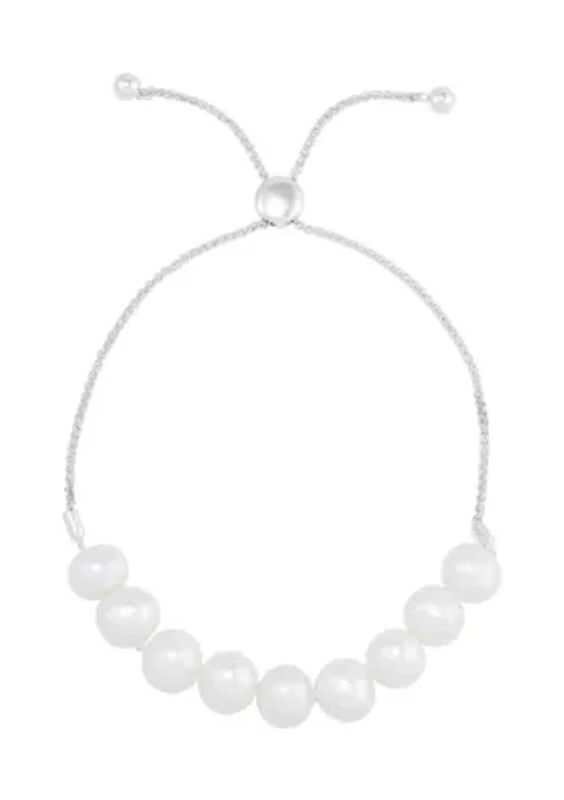 Punctuated with gorgeous pearls, this sterling silver bracelet from Belk & Co. boasts classic sophistication. 9 Pearls Bolo and slider closure Polished finish Imported Belk Exclusive Product Specifications 10" L x 0.33" H Material & Care Sterling silver Clean with a soft cloth