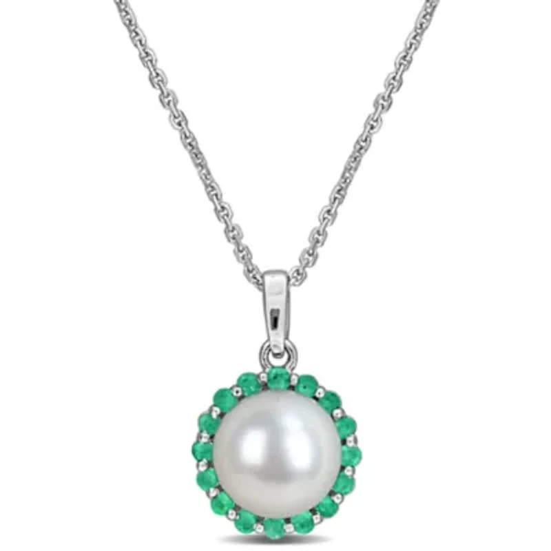 This pendant is crafted in sterling silver and features a luminous freshwater cultured pearl at its center, surrounded by a halo of sparkling gemstones that enhance its natural beauty. Available with sapphire, emerald, or ruby accents, each variation brings its own color and character while maintaining a refined and elegant look. The polished silver setting highlights the contrast between the pearl’s soft glow and the brilliance of the gemstones. Paired with a classic chain, this pendant offers timeless sophistication and graceful versatility, making it a meaningful piece for everyday elegance or special occasions. Lobster closure Polished finish Prong setting Warranty available, 60 days Thailand Imported Belk Exclusive Product Specifications 18" Material & Care Sterling Silver Metal, Sterling silver Clean with a soft cloth.