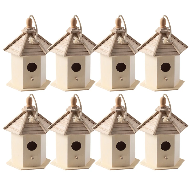 This wood gazebo style birdhouse makes a fun decoration for your home. Embellish with stains, colorful paints, decoupage designs and more.Details:Unfinished 6.61" x 5.71" x 5.51" (16.78cm x 14.5cm x 13.99cm)8 birdhousesHanging cord attachedPlywood and woodFor indoor decorative use only