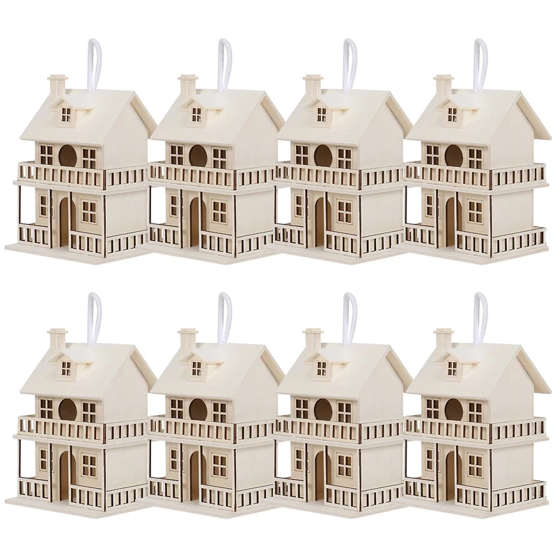 Complete with wrap-around porches and a chimney, this two-story wooden birdhouse makes a wonderful craft project. Decorate with stain, paint, decoupage and miniature figures for a charming piece to display in a corner of your sunroom alongside potted plants and other playful décor.Details:Unfinished6.38" x 5.1" x 9" (16.2cm x 12.95cm x 22.86cm) birdhouse size8 birdhousesPlywood and cottonCord attached for hangingFor indoor decorative use only
