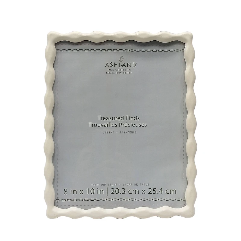 Add a rustic vibe to your decorations with this tabletop frame from Ashland. Crafted in resin with a mid wave border, add your favorite photo and place on your mantel or end table to welcome the warmth of summertime into your home.Details:White8" x 10" (20.3cm x 25.4cm) image size8.6" x 10.55" x 0.9" (21.8cm x 26.8cm x 2.3cm) overall sizeTreasured Finds collectionThick layer of glass protects imageFold-out easel and hanging hardware attachedComplies to TSCA Title VIResin, MDF and glassFor indoor use