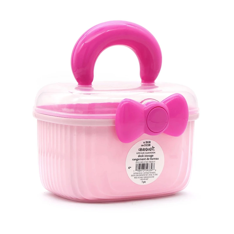 This Cute Club pink desk storage features a bubble handle and a bow latch. The top of the container features a tray with more room for storage underneath making it a great piece for storing trinkets, toys and school supplies.Details:Pink6.81" x 5.79" x 8.27" (17.3cm x 14.7cm x 21cm)PolypropyleneFor ages 4 and up