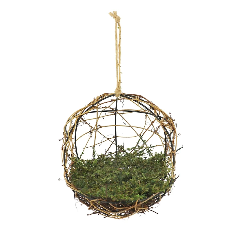 Use this moss next grapevine form to create a pretty spring decoration for home. You can add little sisal birds, foam eggs with a coating or other faux floral accents to create a display you can hang in a windowsill.Details:Brown and green7" x 7" x 8.5" (17.8cm x 17.8cm x 21.6cm)Twig, iron, moss and juteRecommended for indoor use only