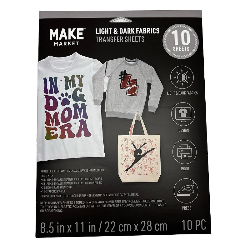 Craft your own custom T-shirts, tote bags, aprons and other fabric accessories with this printable iron-on transfer paper from Make Market. Including sheets designed for use with both light and dark fabrics, just pick your design, print and iron onto the surface of your choice for a unique piece perfect for gifting or showing off your own personal style.Details:For light and dark colored fabrics8.5" x 11" (22cm x 28cm) sheet size10 sheets (5 light and 5 dark)Includes 2 silicone parchment sheetsPrintableInstructions includedCare & Usage: Keep transfer sheets stored in a dry and humidity free environment. Recommended to store in a plastic polybag or within the envelope to avoid accidental creasing or scratching.