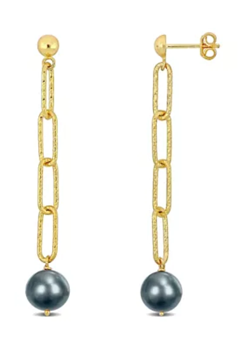 Jazz up with these trendy long Dyed Grey Freshwater Cultured Pearl Oval Link Fancy Chain Earrings. Crafted in lustrous yellow gold plated sterling silver and feature two off-round-shaped dyed grey freshwater cultured pearls (9-10mm) studded above the geometric design and link with paperclip fancy chain. Buffed with luster, these gorgeous earrings are comfortably secures with a butterfly closures. Pair these glamorous earrings with any ensemble for a bold and stylish look. Post back, Butterfly clasp, 2 pearl Polished finish Warranty available, 1 Year Peru Imported Belk Exclusive Product Specifications 65mm Height x 9.5mm Width Material & Care Sterling Silver Metal, Sterling silver Clean with a soft cloth.