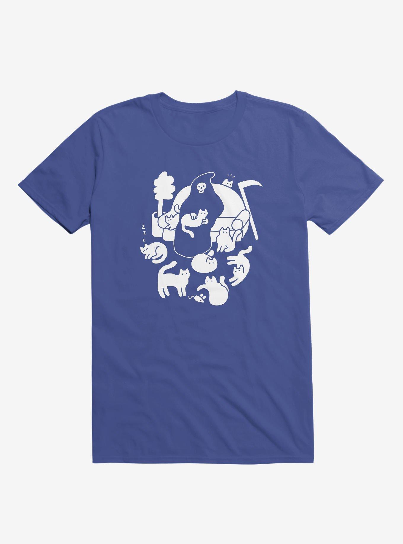 Everybody knows that cats have nine lives. This lightweight royal blue tee shows that rather than wait around all day/month/year/etc. for those nine lives to expire, the Grim Reaper has decided to play with man's best feline friend. Live long, cute lil kitties! Officially licensed art from Obinsun.