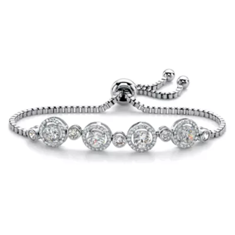 Show off your sense of style with this stunning addition to your jewelry box. Your birthstone is surrounded by sparkling cubic zirconia halos, with a contemporary bolo drawstring design that lets the beaded ends dangle from your wrists in cool style. Birthstones are simulated gemstones. Specify birth month when ordering. .92 carat T.W. 9" length. Platinum-plated.Main Stone: 4 Round Faceted Cut Simulated Birthstones, 5 mm x 5 mmAccent Stone: 89 Cubic Zirconias .92 cttwPlatinum-PlatedMeasures: 8 mm wide x 9 inches long, adjustable x 4 mm highIncludes gift box and drawstring pouchPlatinum-PlatedDimensions: 8 mm wide x 9 inches long, adjustable x 4 mm highIncludes gift box and drawstring pouch No clasp, 93 Polished finish Warranty available China Imported Product Specifications 0.31 in x 9 in x 0.15 in, 9" length 0.9199999999999999 Material & Care Metal Clean with a soft cloth.