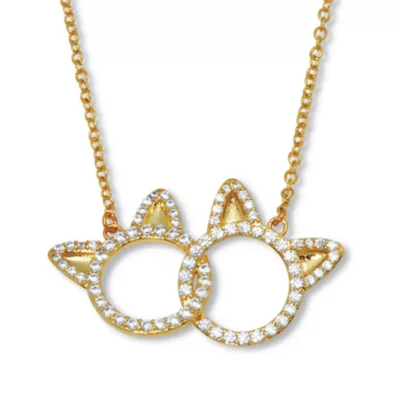Honor your furry friends with this adorable cat necklace. Featuring .95 carat T.W. of round cubic stones, this 14k yellow gold-plated necklace create an eye-catching sparkle. A thoughtful gift for the pet lover in your life. 18 inch chain, plus 2 inch extension.46 Round Faceted Cut Cubic Zirconias, .69 carat total weight, 1.5 mm x 1.5 mm; 32 Round Faceted Cut Cubic Zirconias, .26 carat total weight, 1.2 mm x 1.2 mm14k Gold-PlatedDimensions: 34 mm wide x 18 inches long x 3 mm high, plus 2 inch extensionIncludes gift box and drawstring pouch14k Gold-PlatedDimensions: 34 mm wide x 18 inches long x 3 mm high, plus 2 inch extensionIncludes gift box and drawstring pouch Lobster closure, 78 Polished finish Warranty available China Imported Product Specifications 1.46 in x 18 in x 1.34 in, 18" length 0.946 Material & Care Metal, Gold plated Clean with a soft cloth.