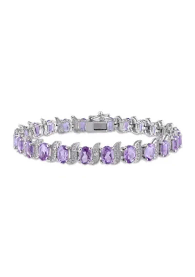 Impress your fashionable friends with this Amethyst and Diamond Tennis Bracelet. Crafted in glistering sterling silver, this beautiful bracelet features oval-cut (6mm x 4mm) amethyst gemstones and three round-cut, pave-set diamonds (H-I, I3). This lovely 7-inch bracelet is comfortably secured with a pressure tongue clasp. Box clasp, 24 Amethyst, 3 diamond Color rating: I, H Clarity rating: I3 Polished finish Prong setting Warranty available, 60 Days China Imported Belk Exclusive Product Specifications 7.4mm Width, 7" 9.6 ct. t.g.w. amethyst, 0.03 ct. t.w. diamond Material & Care Sterling silver Metal, Sterling silver Clean with a soft cloth.