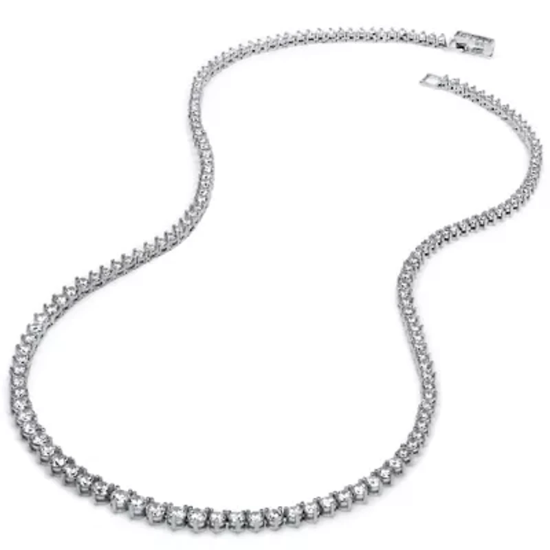 Adorn yourself in elegance with this timeless necklace. You'll love how effortlessly this sparkling platinum-plated necklace elevates any look. Featuring an impressive 9.60 TCW of round cubic zirconia stones with a box clasp.Main Stone: 14 Round Faceted Cut Cubic Zirconias, 2.10 carats total weight, 3.5 mm x 3.5 mm24 Round Faceted Cut Cubic Zirconias, 2.40 carats total weight, 3 mm x 3 mm44 Round Faceted Cut Cubic Zirconias, 2.64 carats total weight, 2.5 mm x 2.5 mmPlatinum-Plated, Silvertone; Dimensions: 4 mm wide x 18 inches long x 3 mm highIncludes gift box and drawstring pouchPlatinum-Plated, SilvertoneDimensions: 4 mm wide x 18 inches long x 3 mm highIncludes gift box and drawstring pouch Box clasp, 159 Polished finish Warranty available China Imported Product Specifications 0.28 in x 18 in x 0.16 in, 18" length 9.591 Material & Care Metal Clean with a soft cloth.