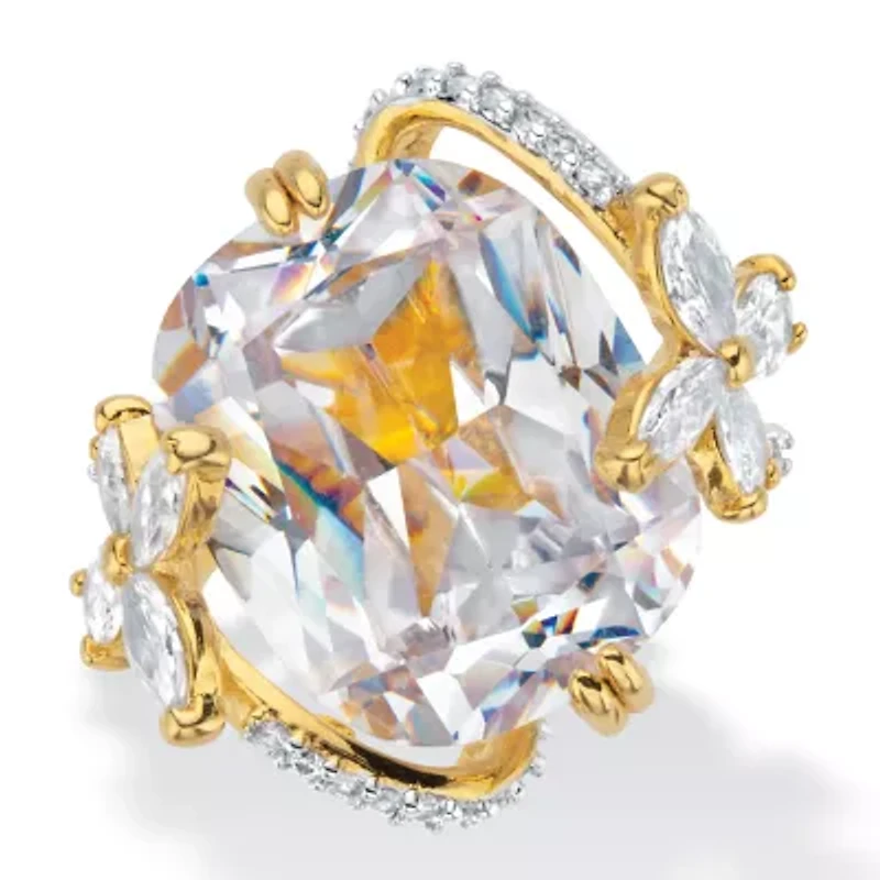 Bling for days! This stunner features an amazing cushion cut cubic zirconia that shines like the sun. Adorned by sparkling butterflies and delicate cz rounds, it's the fun cocktail ring you'll want to wear long after the party's over. 9.8 carats T.W. Plated in 14K gold. Sizes 6-10.Main Stone: 1 Cushion Faceted Cut Cubic Zirconia, 17 mm x 17 mmAccent Stone: 64 Cubic Zirconias 1.80 cttw14k Gold-Plated, SilvertoneMeasures: 21.5 mm wide x 23 mm long x 10 mm high; Shank Width: 1.9 mm wideIncludes gift box and drawstring pouch14k Gold-Plated, SilvertoneShank Width: 1.9 mm wideDimensions: 21.5 mm wide x 23 mm long x 10 mm highIncludes gift box and drawstring pouch 65 Polished finish Warranty available China Imported Product Specifications 1.24 in x 0.91 in x 0.85 in 1.8 Material & Care Metal, Gold plated Clean with a soft cloth.