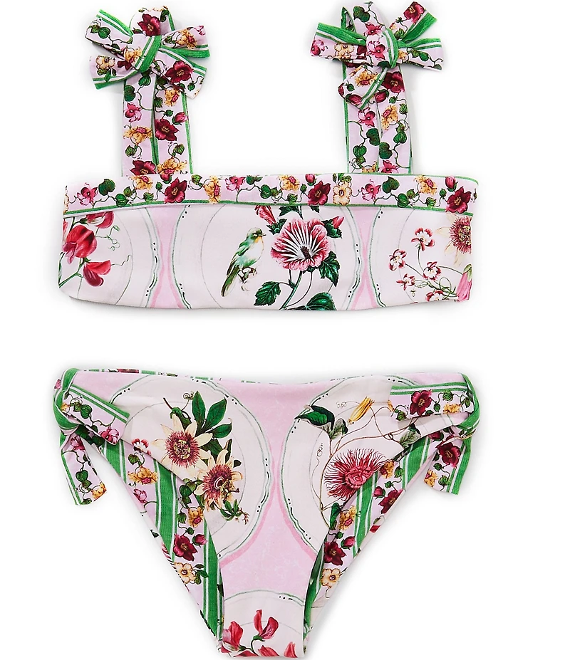 From A Loves A girls, this swimsuit features: Top: Reversible Print tie shoulder bralette Square neckline Sleeveless Removable cups Pullover styling Bottoms: Reversible Classic fit Side tie detailing Pull-on styling Care: Polyester blend Machine wash/tumble dry Imported.
