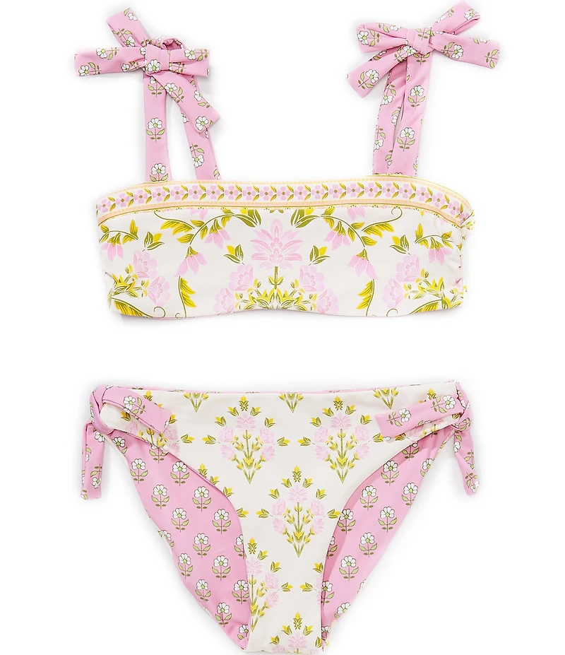From A Loves A, this swimsuit features: Top: Print tie shoulder bralette Square neckline Sleeveless Removable cups Pullover styling Bottoms: Classic fit Side tie detailing Pull-on styling Care: Nylon Spandex Blend Machine wash/tumble dry Imported.