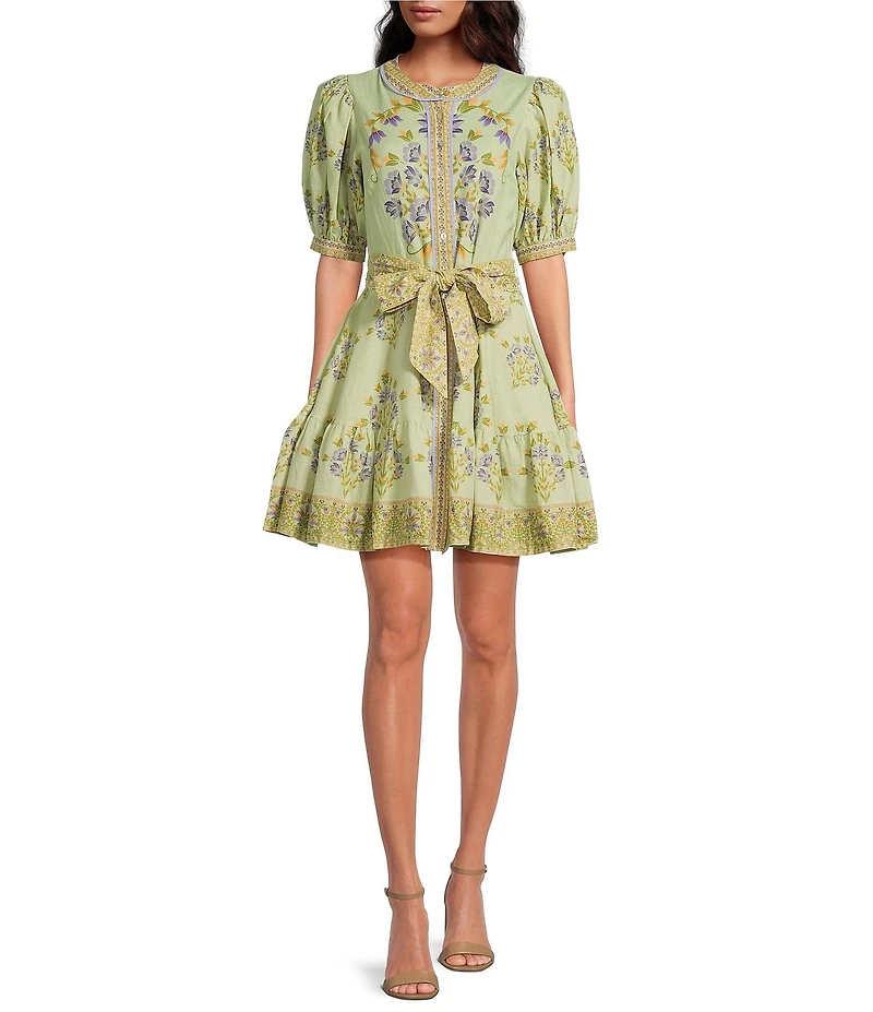 A Loves A Floral Woven Linen Round Neck Short Bubble Sleeve Button Front Tie at Waist A-Line Flounce Mini Dress