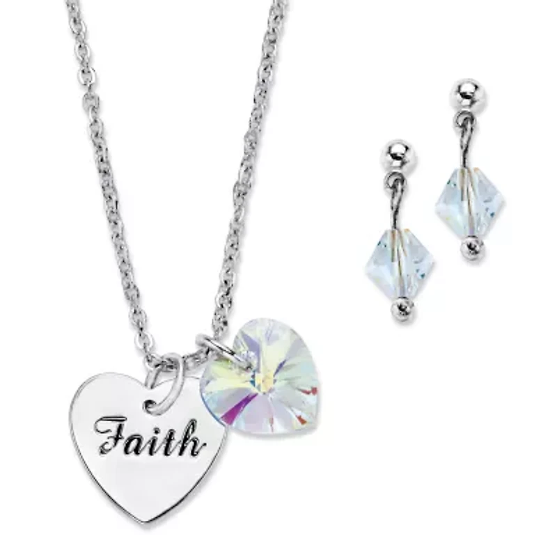 AB Crystal Silvertone Heart and "Faith" Charm Earring & Necklace Set 18"-20"