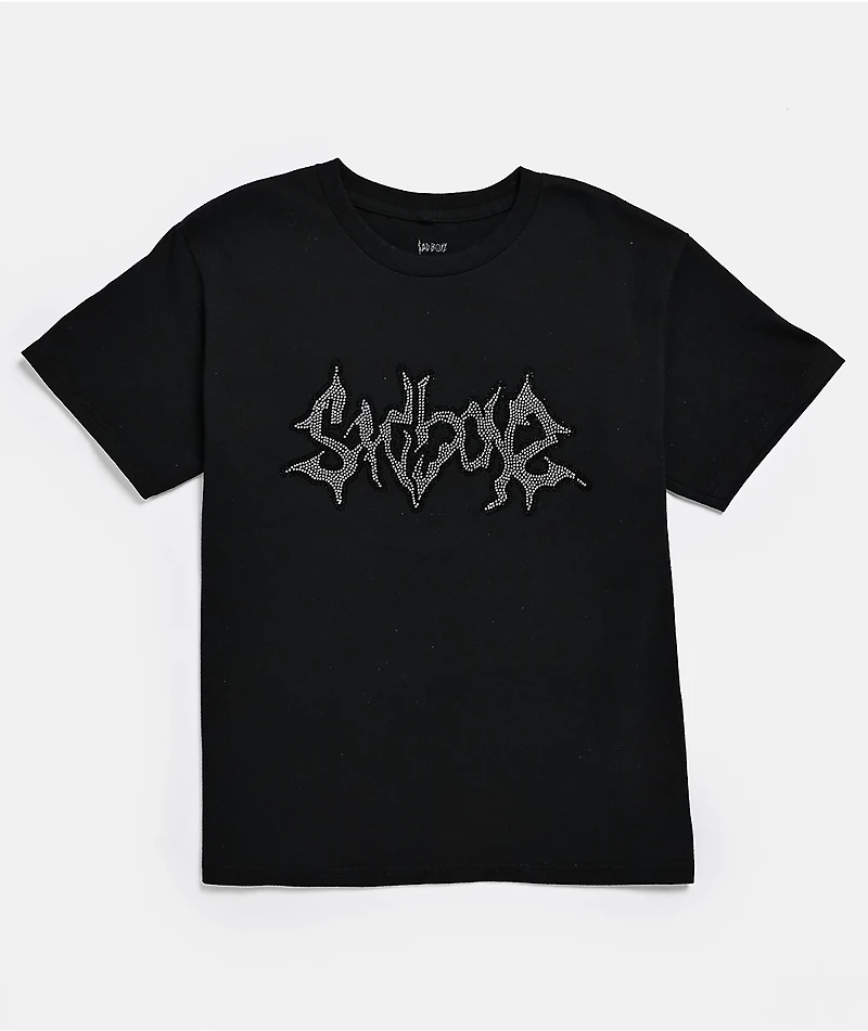 With clean branding up front and a statement graphic on the back, the Broken Heart rhinestone black t-shirt from $AD BOYZ by Junior H keeps things balanced. Rhinestone detailing highlights the chest logo, while a red broken heart graphic with silver