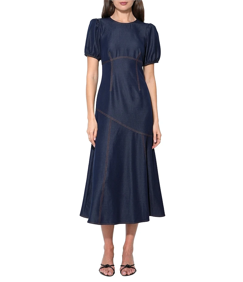 From Adelyn Rae, this dress features: Denim woven fabrication  A line silhouette  Crew neckline  Short puff sleeves  Zip back closure  Approx. 51" length  Polyester/Cotton/Spandex  Hand wash   Imported.