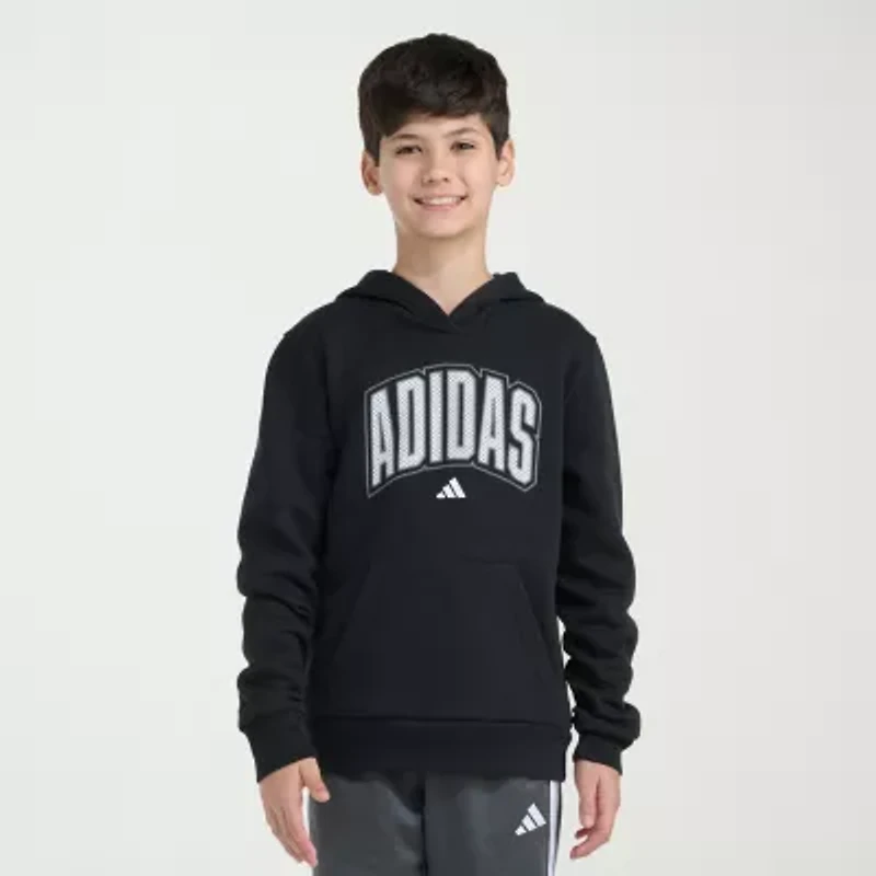 This adidas big boy's fleece hoodie will give him a bold sporty look for sports or everyday hangs. Made from soft cotton-fleece, this hooded pullover has cool logo artwork on the front and long sleeves. Wear it with track pants or shorts.