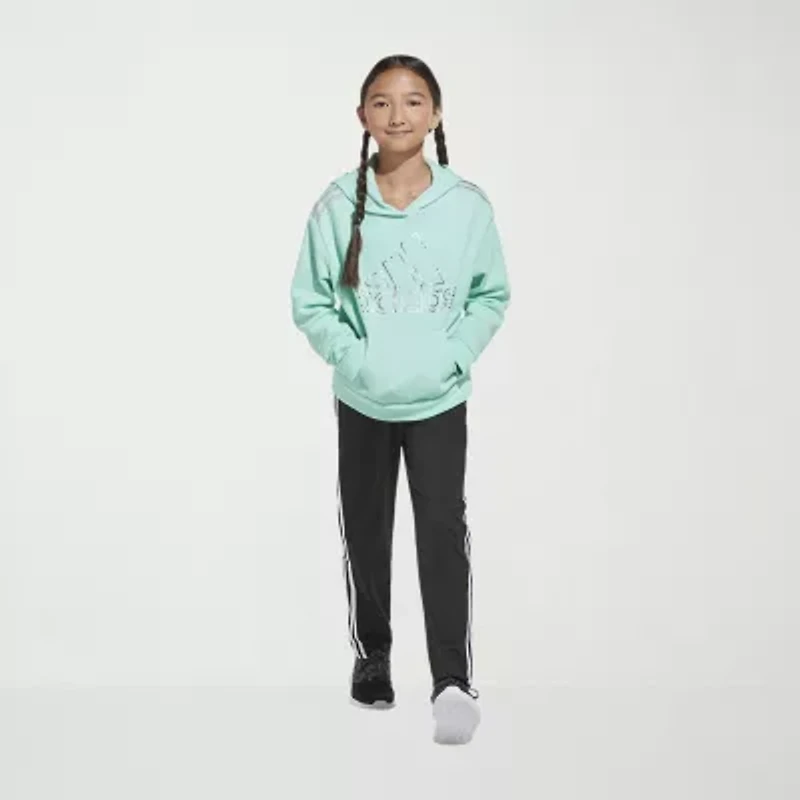This pair of adidas mid-rise track pants will give your big girl a sporty style edge. Made from soft tricot with a subtle sheen, this tapered-leg style has a comfortable flat front elastic waist, side pockets, and the brand's signature three-stripe design and logo. Wear them with a tee or tank top.
