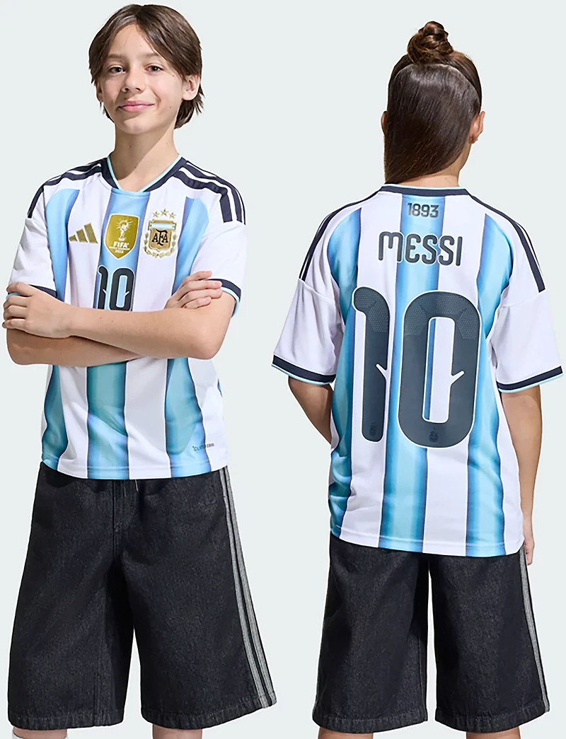 The adidas Kids' Lionel Messi Argentina 2026 World Cup Home Replica Jersey is a tribute to the champions of the world. Celebrating Argentina's football DNA, this jersey is a nod to the iconic victories of '78, '86, and '22. It captures the essence of the team's journey to glory. This jersey is crafted with Climacool technology. Cool. Dry. Ready. Climacool wicks and disperses sweat for a cool, dry, and distraction-free performance. The wicking and quick-drying fabric manages sweat, keeping them dry and comfortable during every match. The bold 3-Stripes and seasonal collar add a touch of adidas heritage, making it a must-have for any young football enthusiast.