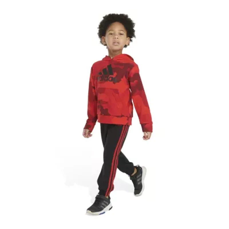 adidas makes it easy for kids to coordinate their sport looks with outfits like this two-piece hoodie and pants set. Both the pullover hoodie and jogger-style pants are made from soft French terry. Boys can wear the durable, easy-to-clean pieces separately or as a set.