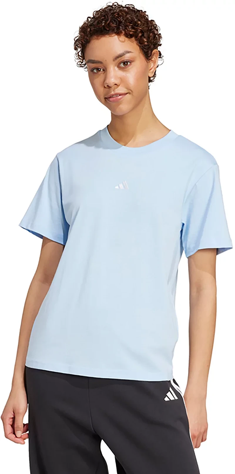 Look your best when you wear the adidas Women's Essentials Small Logo Cotton T-shirt. It is made with 100% cotton. The short sleeves keep you cool, and its crew neck offers a casual style. The traditional 3-stripes branding and a small Sportswear logo offer a decorative touch.