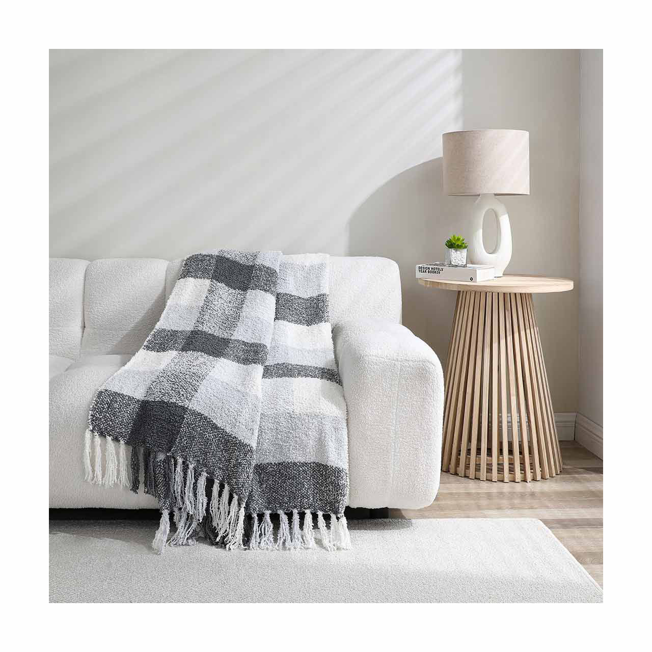 Wrap yourself in the cozy charm of our Adirondack Throw Blanket, designed to bring warmth and style to any room. Measuring a generous 50 x 60 inches, this luxurious throw is perfect for snuggling up on the couch, adding an extra layer of comfort to your bed, or enhancing your living space with its timeless design. Crafted from high-quality, ultra-soft material, the Adirondack Throw Blanket features a classic plaid pattern in soothing shades of gray and white. This versatile color scheme effortlessly complements any decor, making it an ideal addition to your home whether you're aiming for a modern, rustic, or traditional look. The blanket boasts a delightful texture that feels incredibly soft against the skin, providing the perfect companion for those chilly evenings or lazy weekend mornings. The fringed edges add a touch of elegance and a hint of rustic charm, enhancing the overall aesthetic of this beautiful throw. Not only is the Adirondack Throw Blanket stylish and comfortable, but it's also practical. Its durable construction ensures long-lasting use, and it's easy to care for – simply machine wash and tumble dry on low to keep it looking and feeling fresh. Whether you're draping it over your favorite armchair, using it as a decorative piece at the foot of your bed, or gifting it to a loved one, the Adirondack Throw Blanket is sure to bring warmth and joy to any setting. Experience the perfect blend of comfort and style with this must-have accessory from pOpshelf.