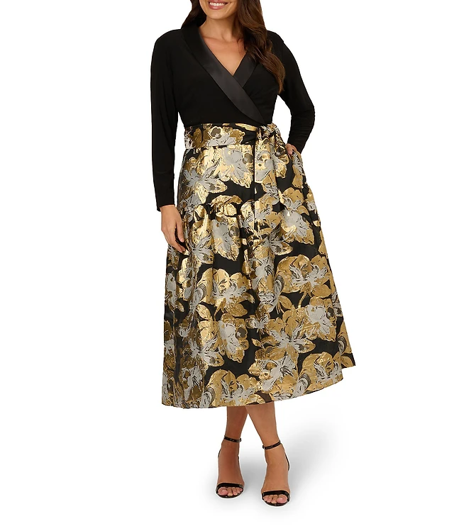 Adrianna Papell Plus Size Floral Jacquard Lapel V-Neck Long Sleeve Side Pocket Tuxedo Midi Dress