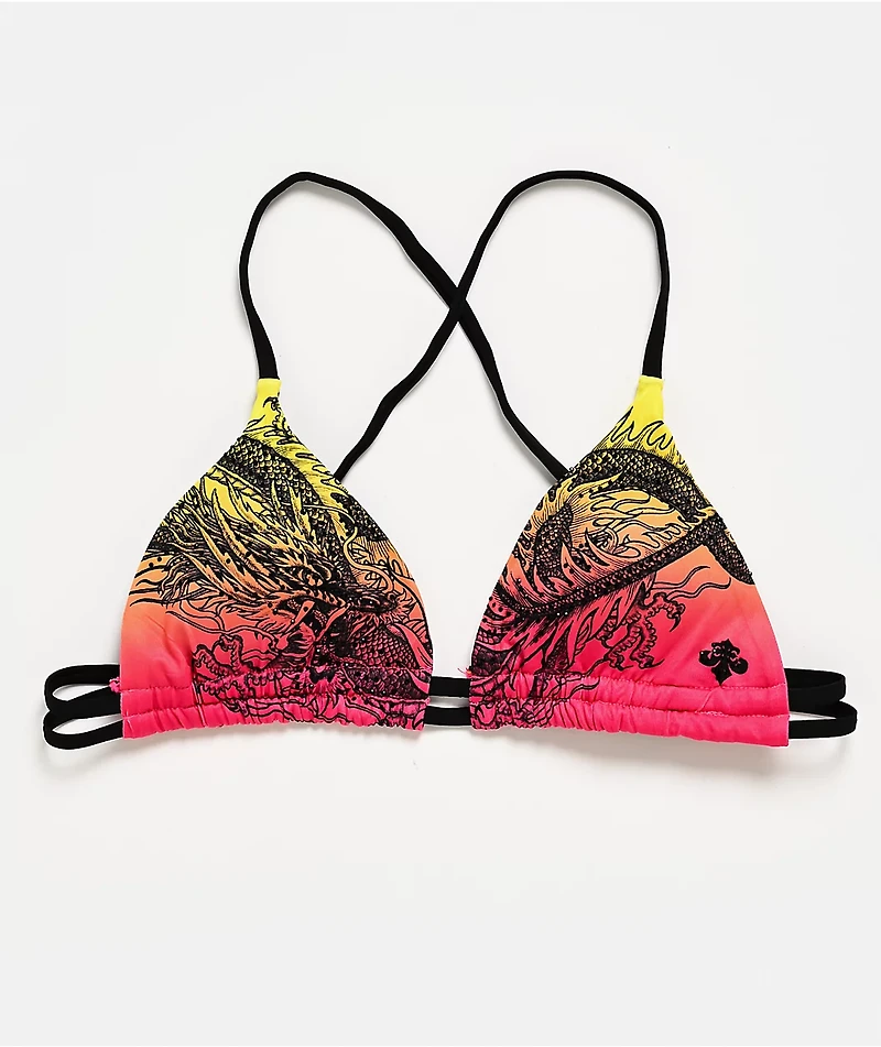 Arriving with a colorful pink to yellow gradient, the Flaming Dragon triangle bikini top from Affliction adds eye-catching pop to any beach or pool outfit. Tattoo inspired artwork of a dragon adorned with black rhinestones imparts the swim top with a