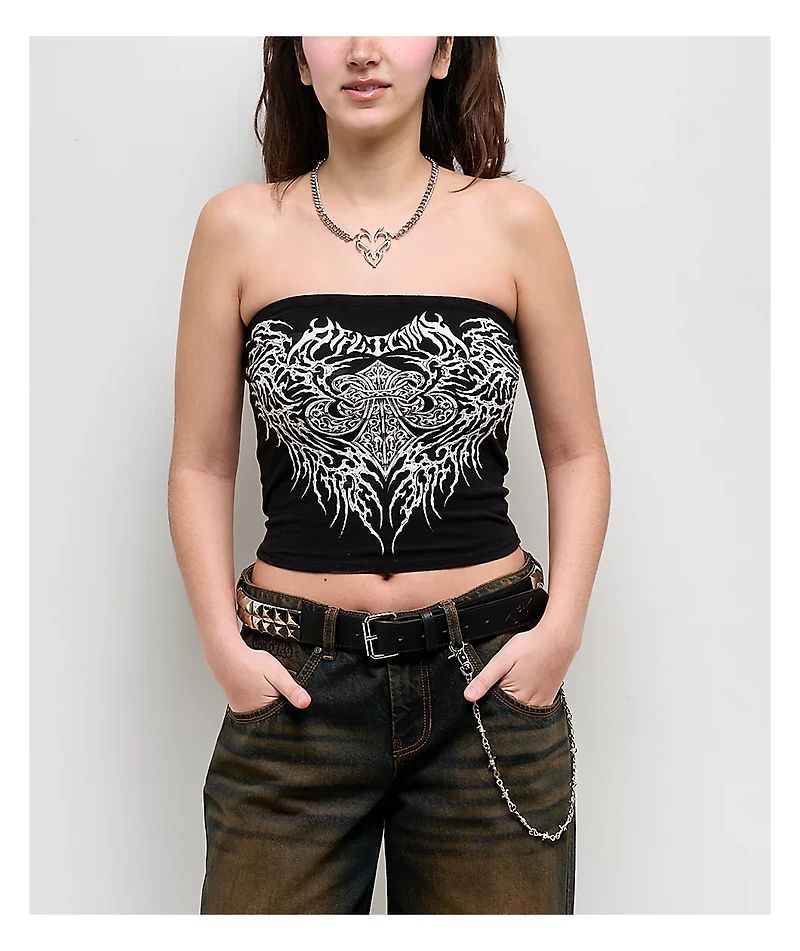 White graphics on a solid black base make the Liquid Signify tube top from Affliction, centered with a fleur-de-lis surrounded by swirling, cybersigilism linework. An elastic top hem holds the shape, while three separate back ties add an adjustable d